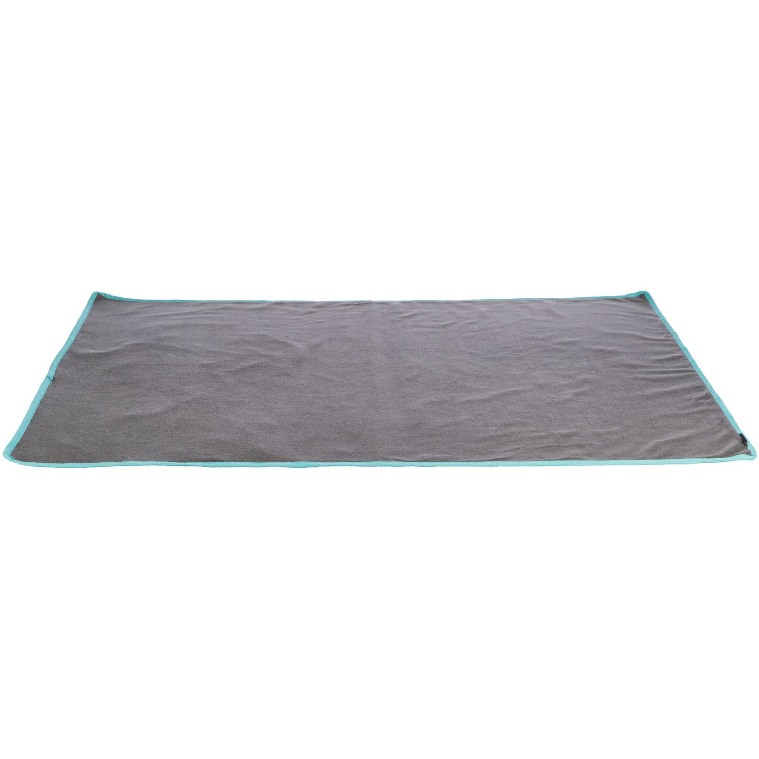 Verkrijgbaar in 2 afmetingen. De matten zijn grijs en de rand is gebiest in turquoise.